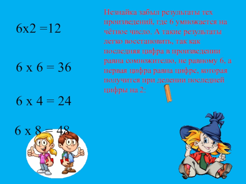 Незнайка забыл результаты тех произведений, где 6 умножается на чётное число. А такие результаты легко восстановить, так как последняя цифра в произведении равна сомножителю, не равному 6, а первая цифра равна цифре, которая получится при делении последней цифры на 2: