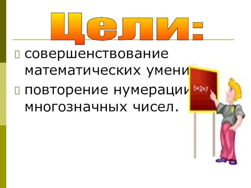 совершенствование математических умений;повторение нумерации многозначных чисел.Цели: