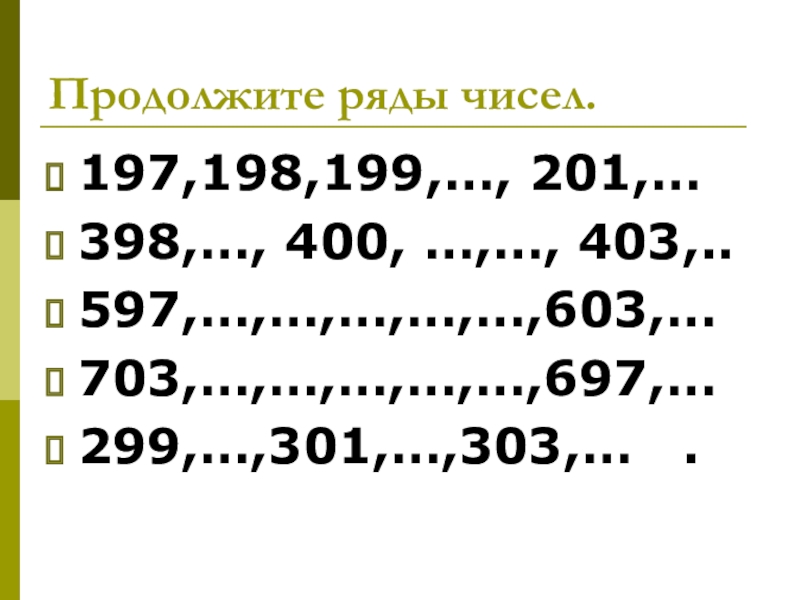 Продолжите ряды чисел.197,198,199,…, 201,…398,…, 400, …,…, 403,..597,…,…,…,…,…,603,…703,…,…,…,…,…,697,…299,…,301,…,303,…  .