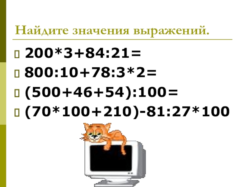 Найдите значения выражений.200*3+84:21=800:10+78:3*2=(500+46+54):100=(70*100+210)-81:27*100
