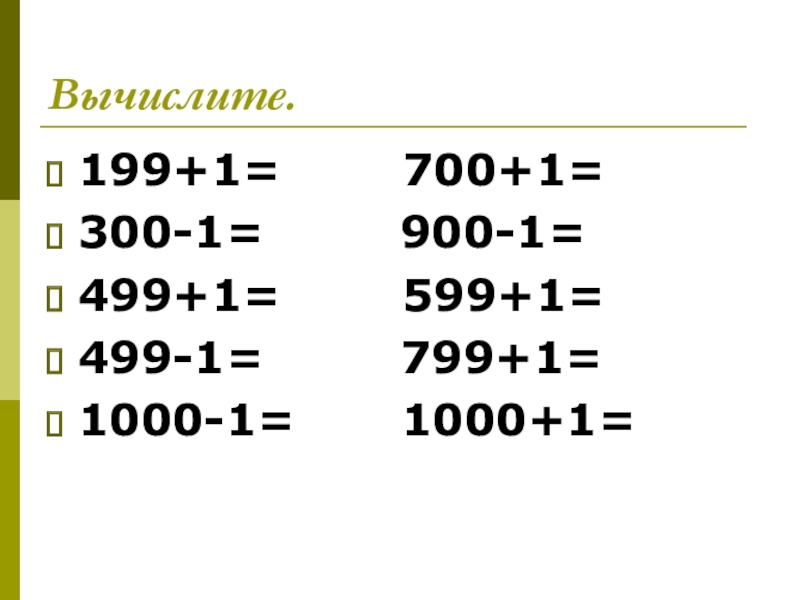 Вычислите.199+1=    700+1=300-1=     900-1=499+1=    599+1=499-1=