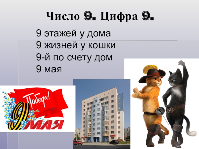 Число 9. Цифра 9.  9 этажей у дома  9 жизней у кошки  9-й по
