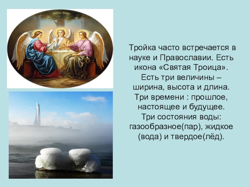 Слайд 12Тройка часто встречается в науке и Православии. Есть икона «Святая Троица».