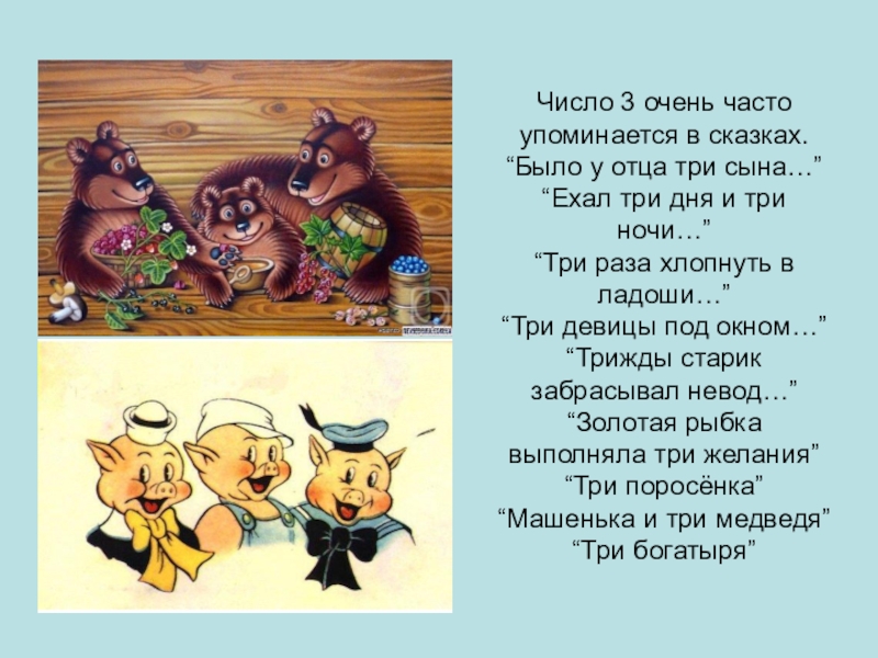 сына…” “Ехал три дня и три ночи…” “Три раза хлопнуть в ладоши…” “Три девицы под окном…” “Трижды старик забрасывал невод…” “Золотая рыбка выполняла три желания” “Три поросёнка” “Машенька и три медведя” “Три богатыря”