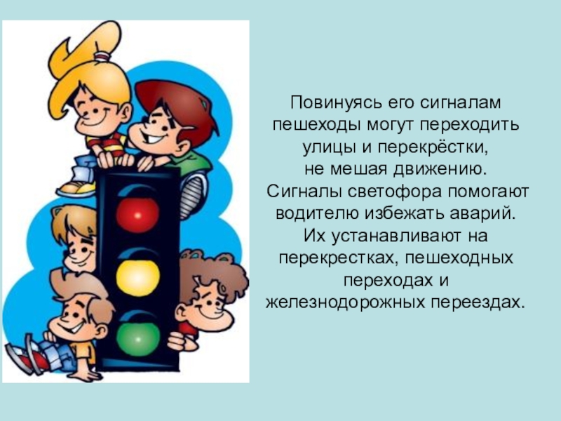 Слайд 9Повинуясь его сигналам пешеходы могут переходить улицы и перекрёстки, не мешая движению. Сигналы