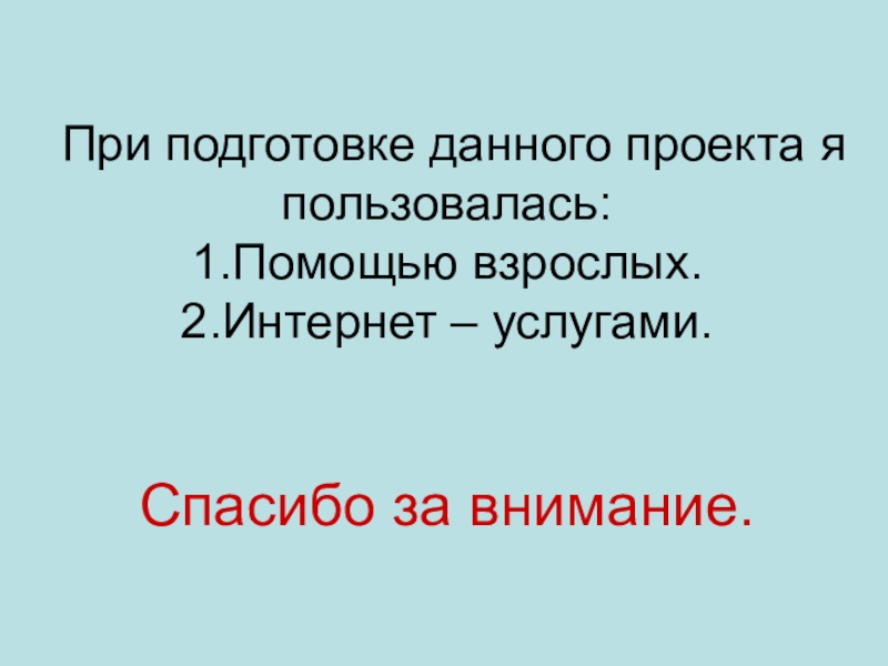 Слайд 13При подготовке данного проекта я пользовалась: 1.Помощью взрослых. 2.Интернет – услугами. Спасибо за