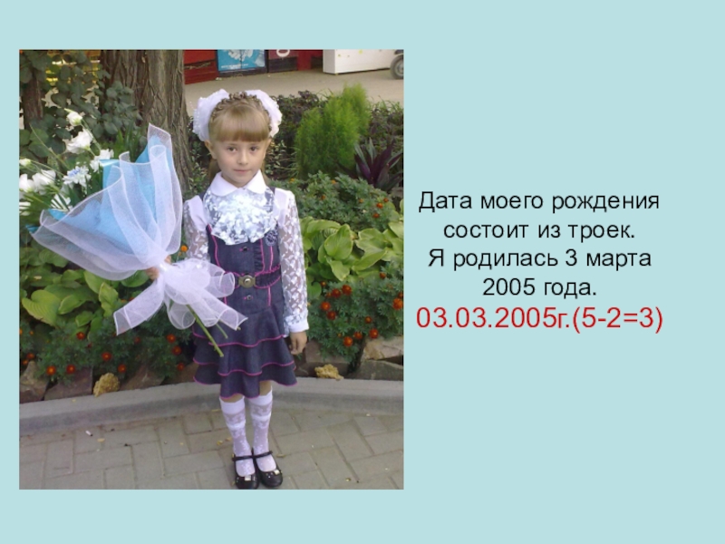 Слайд 3Дата моего рождения состоит из троек. Я родилась 3 марта 2005