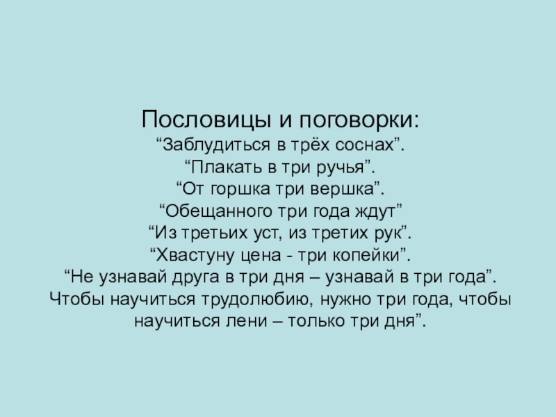 Пословицы и поговорки: “Заблудиться в трёх соснах”. “Плакать в три ручья”. “От горшка три вершка”. “Обещанного три