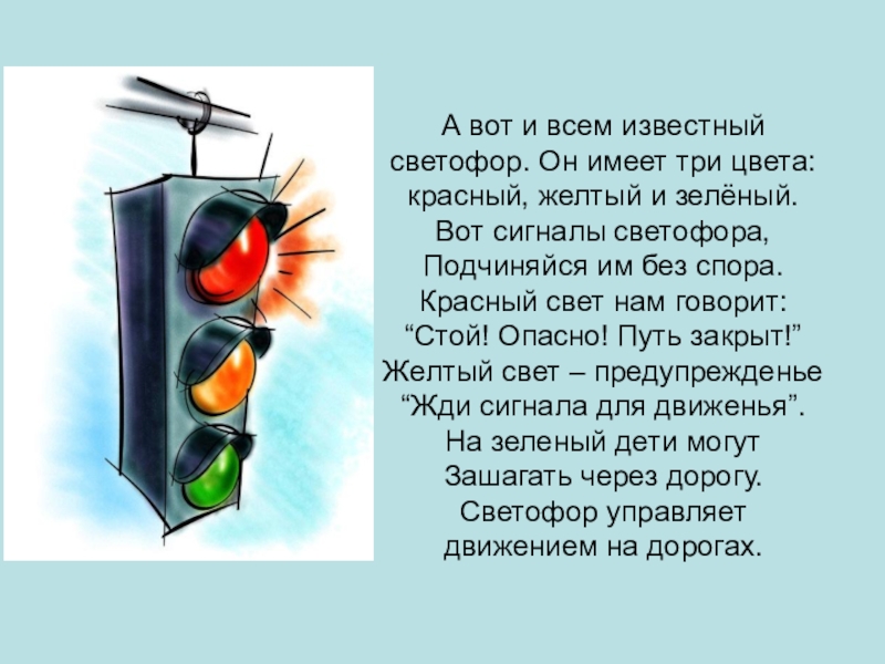 желтый и зелёный. Вот сигналы светофора, Подчиняйся им без спора. Красный свет нам говорит: “Стой! Опасно! Путь закрыт!” Желтый свет – предупрежденье “Жди сигнала для движенья”. На зеленый дети могут Зашагать через дорогу. Светофор управляет движением на дорогах.