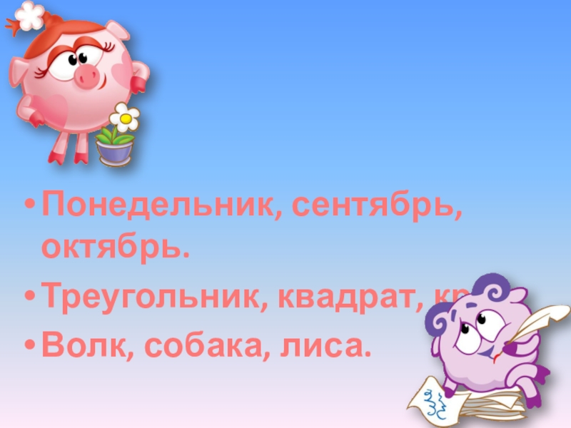 Понедельник, сентябрь, октябрь.Треугольник, квадрат, круг.Волк, собака, лиса.