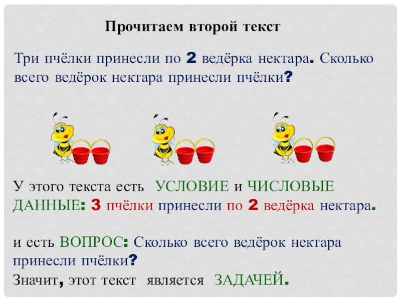 У этого текста есть УСЛОВИЕ и ЧИСЛОВЫЕ ДАННЫЕ: 3 пчёлки принесли по 2 ведёрка нектара.