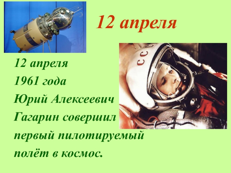 12 апреля12 апреля 1961 годаЮрий АлексеевичГагарин совершил первый пилотируемый полёт в космос.