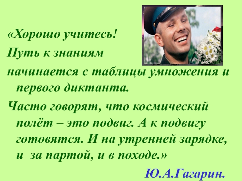 «Хорошо учитесь!Путь к знаниям начинается с таблицы умножения и первого диктанта. Часто говорят, что космический полёт –
