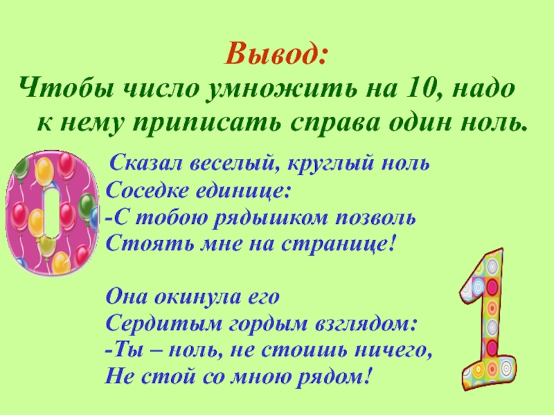 Вывод:Чтобы число умножить на 10, надо к нему приписать справа один ноль.
