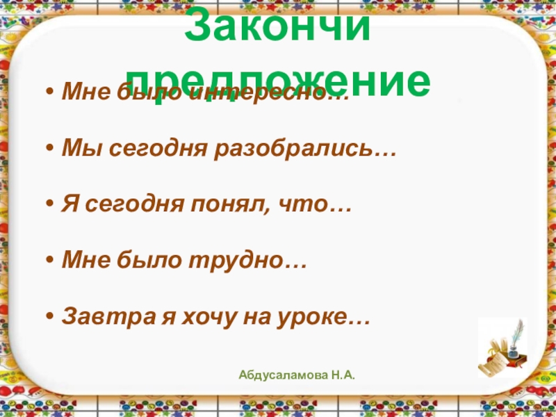Закончи предложениеМне было интересно…Мы сегодня разобрались…Я сегодня понял, что…Мне было трудно…Завтра я хочу на уроке…