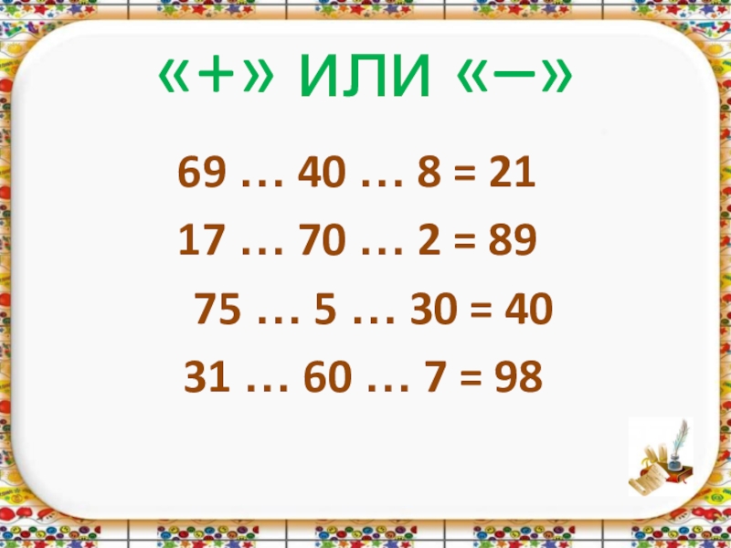«+» или «–»69 … 40 … 8 = 21 17 … 70 … 2 = 89