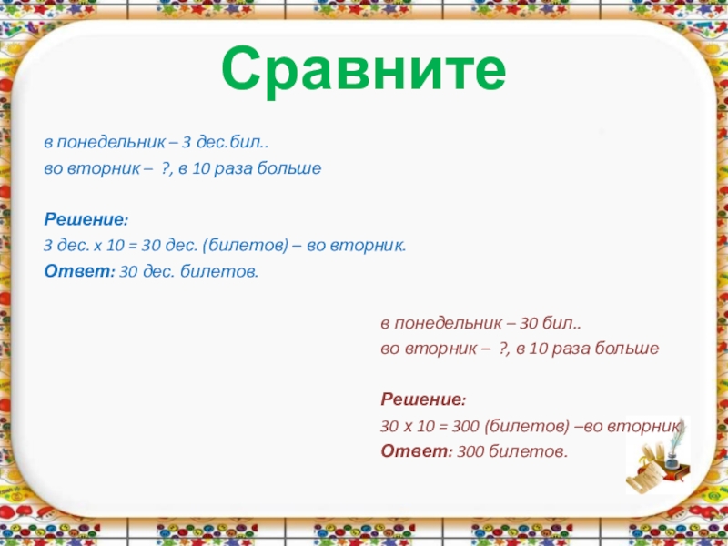 Сравните в понедельник – 3 дес.бил..во вторник – ?, в 10 раза большеРешение:3 дес. x 10 =