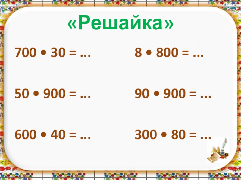 «Решайка»700 • 30 = ...       8 • 800 = ...50 •