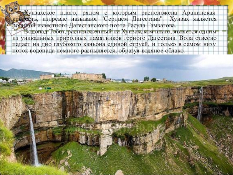 Слайд 26Хунзахское плато, рядом с которым расположена Аранинская крепость, издревле называют "Сердцем