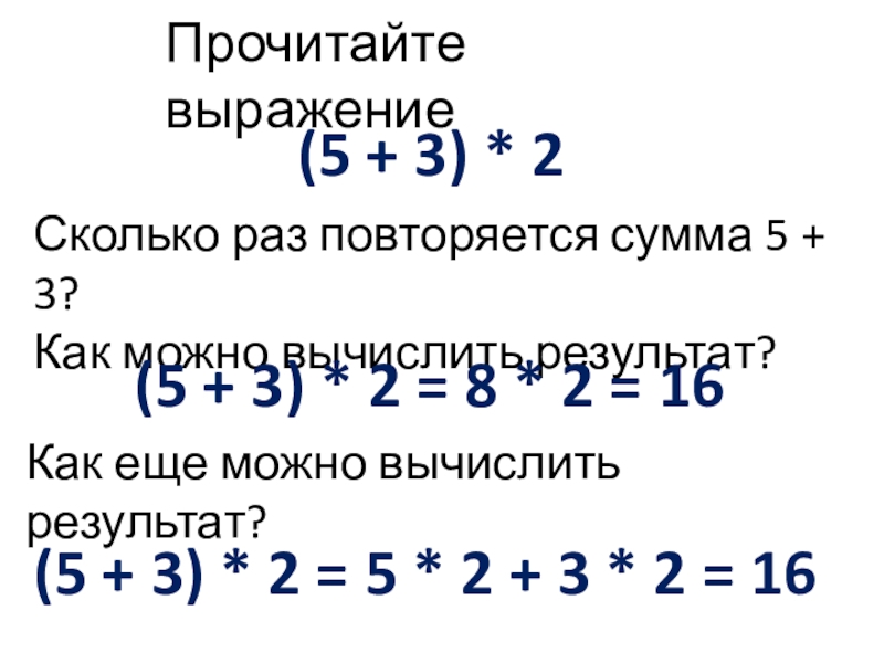 (5 + 3) * 2 = 5 * 2 + 3 * 2 = 16