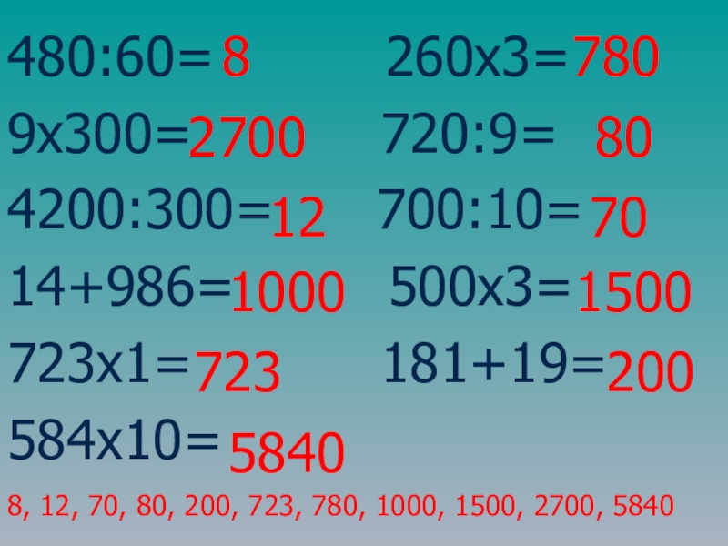 8, 12, 70, 80, 200, 723, 780, 1000, 1500, 2700, 5840