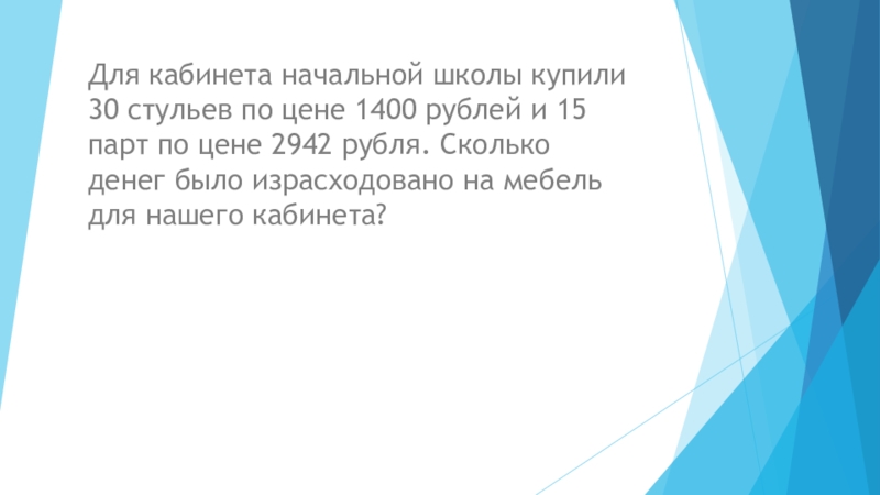 Слайд 12Для кабинета начальной школы купили 30 стульев по цене 1400 рублей