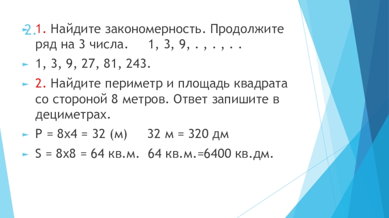 2. Найдите периметр и площадь квадрата со стороной 8 метров. Ответ запишите в дециметрах.