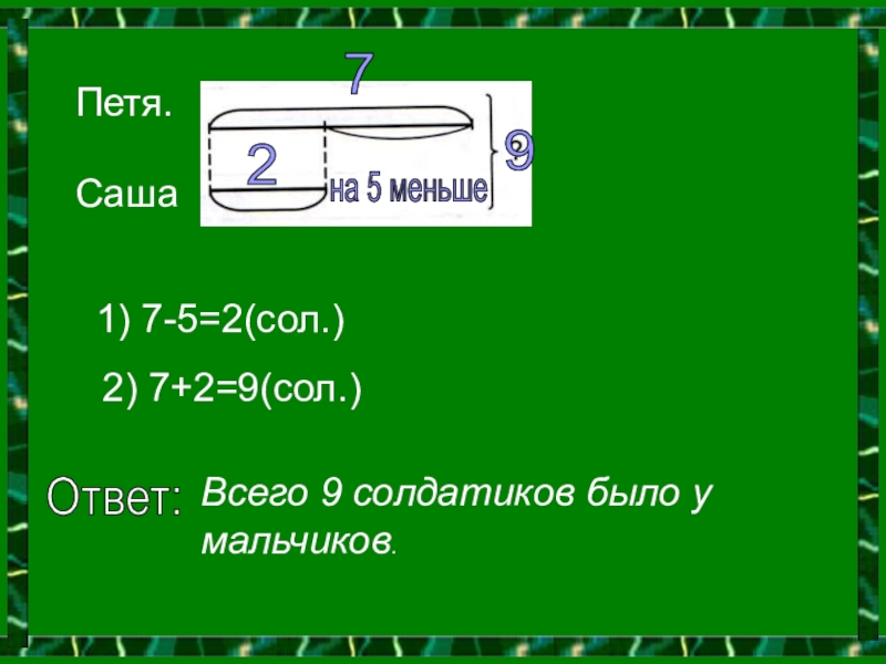 Петя.Саша1) 7-5=2(сол.)2) 7+2=9(сол.)Ответ: Всего 9 солдатиков было у мальчиков.7на 5 меньше29