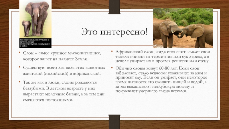 Африканский слон, когда стоя спит, кладет свои тяжелые бивни на термитник или сук дерева, а в неволе упирает их в проемы решетки или стену.