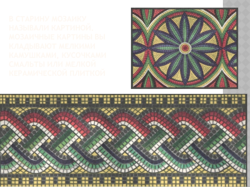 Слайд 10В старину мозаику называли картиной. Мозаичные картины выкладывают мелкими камушками, кусочками