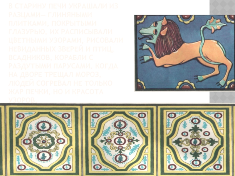 цветными узорами, рисовали невиданных зверей и птиц, всадников, корабли с раздутыми парусами. Когда на дворе трещал мороз, людей согревал не только жар печки, но и красота узоров.