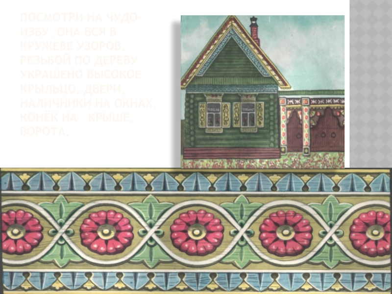 Слайд 7Посмотри на чудо-избу. Она вся в кружеве узоров.