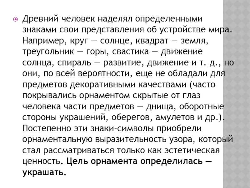 круг — солнце, квадрат — земля, треугольник — горы, свастика — движение солнца, спираль — развитие, движение и т. д., но они, по всей вероятности, еще не обладали для предметов декоративными качествами (часто покрывались орнаментом скрытые от глаз человека части предметов — днища, оборотные стороны украшений, оберегов, амулетов и др.). Постепенно эти знаки-символы приобрели орнаментальную выразительность узора, который стал рассматриваться только как эстетическая ценность. Цель орнамента определилась — украшать.
