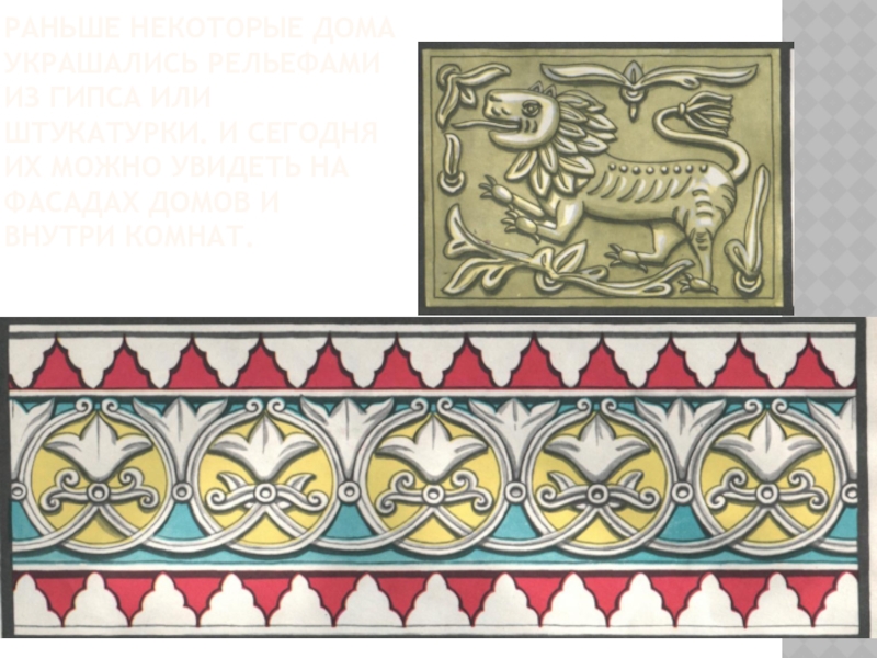 Слайд 8Раньше некоторые дома украшались рельефами из гипса или штукатурки. И сегодня