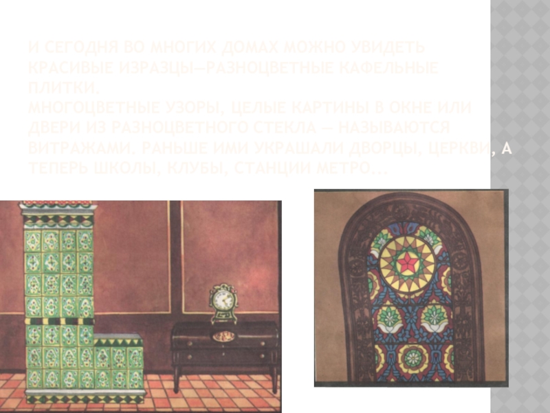 Слайд 12И сегодня во многих домах можно увидеть красивые изразцы—разноцветные кафельные плитки.