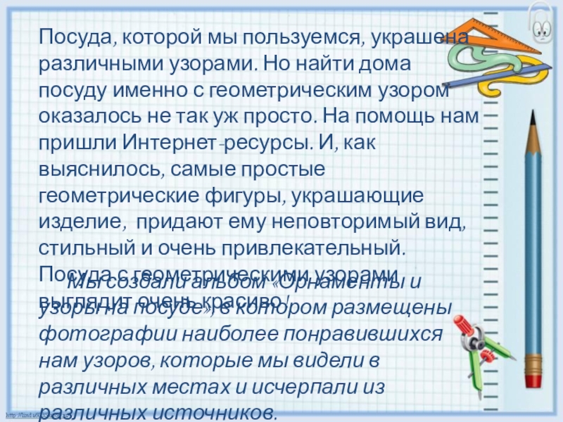 Мы создали альбом «Орнаменты и узоры на посуде», в котором размещены фотографии наиболее понравившихся нам узоров, которые мы видели в различных местах и исчерпали из различных источников.
