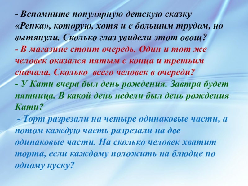 - Вспомните популярную детскую сказку «Репка», которую, хотя и с