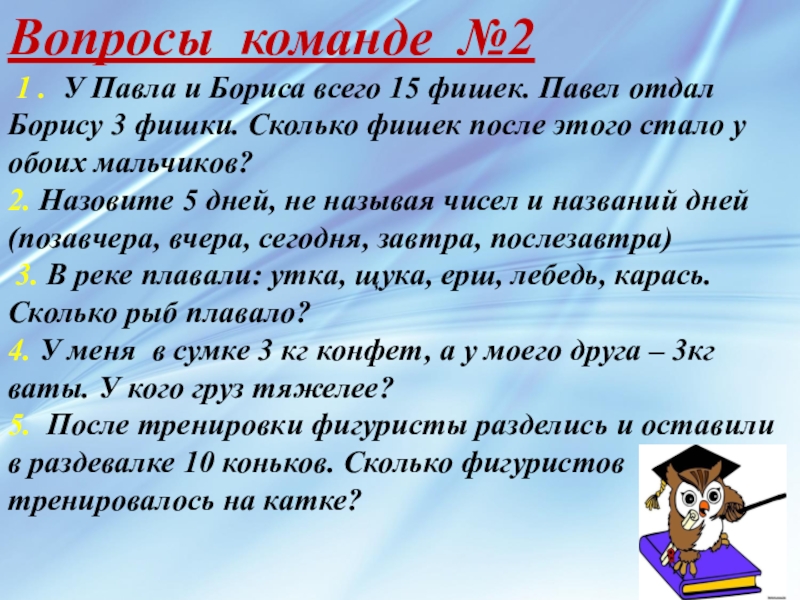 4. У меня в сумке 3 кг конфет, а у моего друга – 3кг ваты. У кого груз тяжелее?