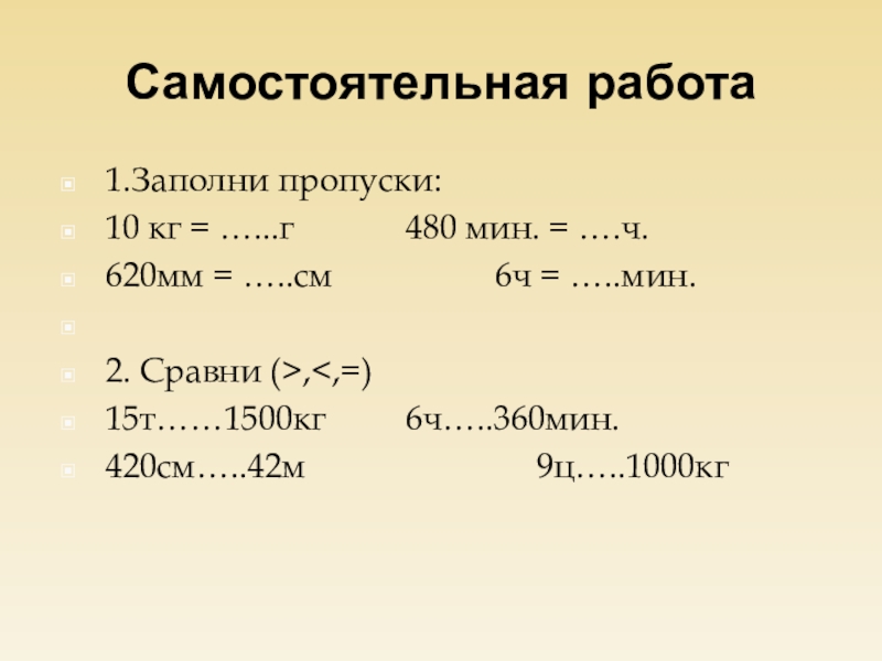 Самостоятельная работа1.Заполни пропуски:10 кг = …...г			480 мин. = ….ч.620мм = …..см