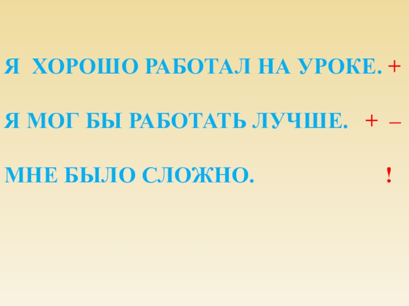 Я ХОРОШО РАБОТАЛ НА УРОКЕ. +Я МОГ БЫ РАБОТАТЬ ЛУЧШЕ.  + – МНЕ БЫЛО СЛОЖНО.