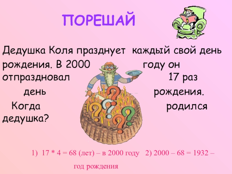 1) 17 * 4 = 68 (лет) – в 2000 году 2) 2000 – 68 = 1932 –