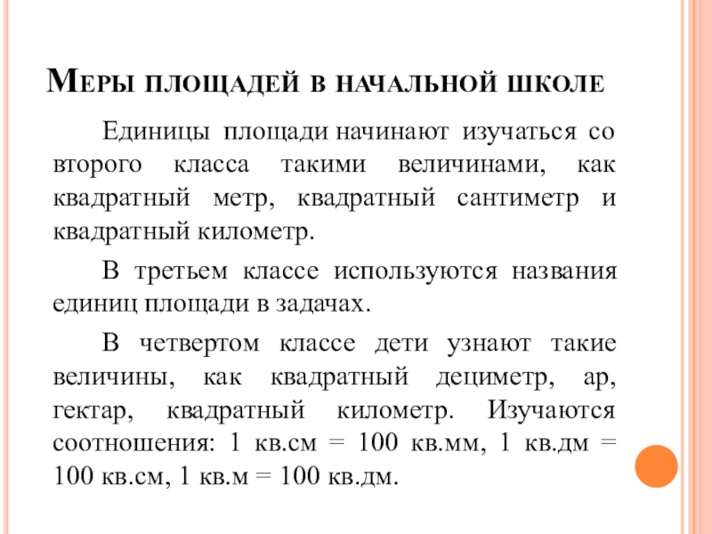 величинами, как квадратный метр, квадратный сантиметр и квадратный километр.