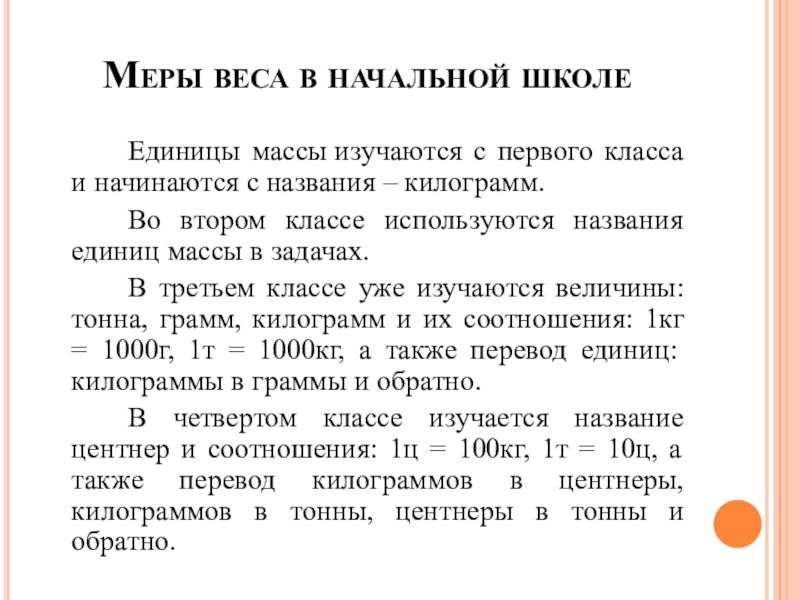 В четвертом классе изучается название центнер и соотношения: 1ц = 100кг, 1т = 10ц, а также перевод килограммов в центнеры, килограммов в тонны, центнеры в тонны и обратно.