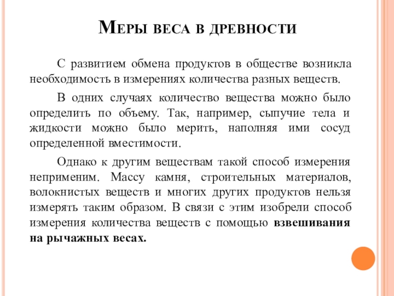 Однако к другим веществам такой способ измерения неприменим. Массу камня, строительных материалов, волокнистых веществ и многих других продуктов нельзя измерять таким образом. В связи с этим изобрели способ измерения количества веществ с помощью взвешивания на рычажных весах.