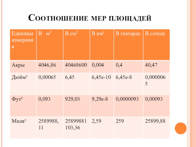 существовали свои единицы — югер, актус, центурия, арура. В современном мире принята обобщенная таблица, которая действует в любой стране. Здесь выделяют квадратный километр (1 000 000 метров квадратных), гектар (10 000 квадратных метров), ар или сотка (100 квадратных метров), квадратный дециметр, квадратный сантиметр, квадратный миллиметр, барн.