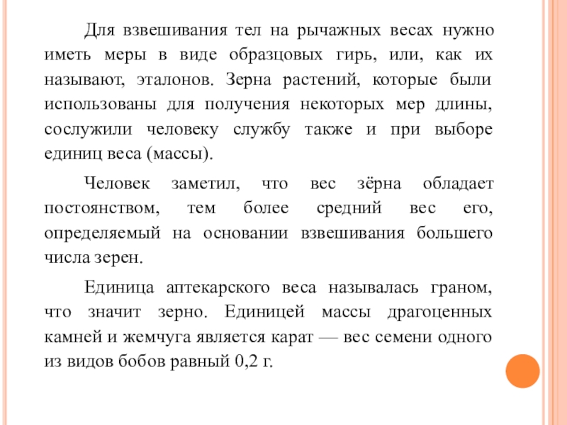 образцовых гирь, или, как их называют, эталонов. Зерна растений, которые были использованы для получения некоторых мер длины, сослужили человеку службу также и при выборе единиц веса (массы).