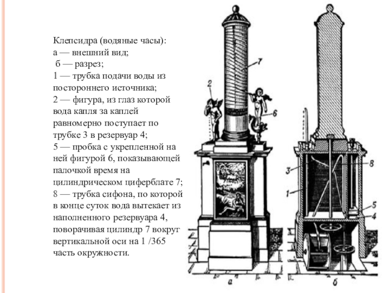5 — пробка с укрепленной на ней фигурой 6, показывающей палочкой время на цилиндрическом циферблате 7; 8 — трубка сифона, по которой в конце суток вода вытекает из наполненного резервуара 4, поворачивая цилиндр 7 вокруг вертикальной оси на 1 /365 часть окружности.