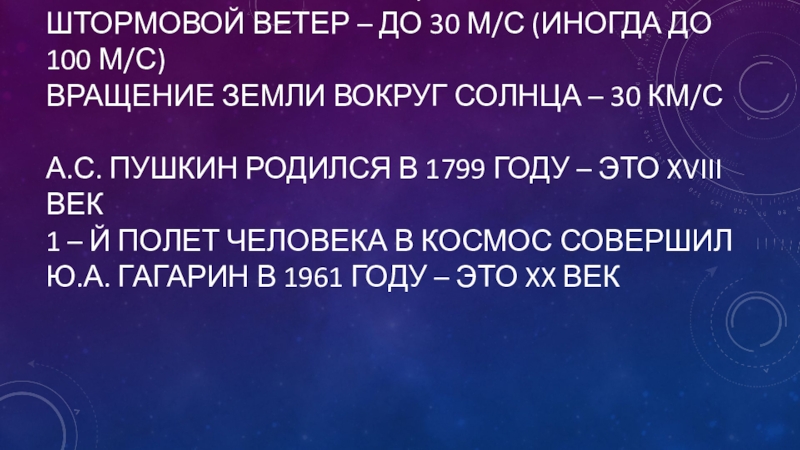 (иногда до 100 м/с) Вращение Земли вокруг Солнца – 30 км/с А.С. Пушкин родился в 1799 году – это xviii век 1 – й полет человека в космос совершил Ю.А. гагарин в 1961 году – это xx век