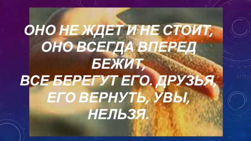 Слайд 5 Оно не ждет и не стоит, оно всегда вперед бежит, все берегут