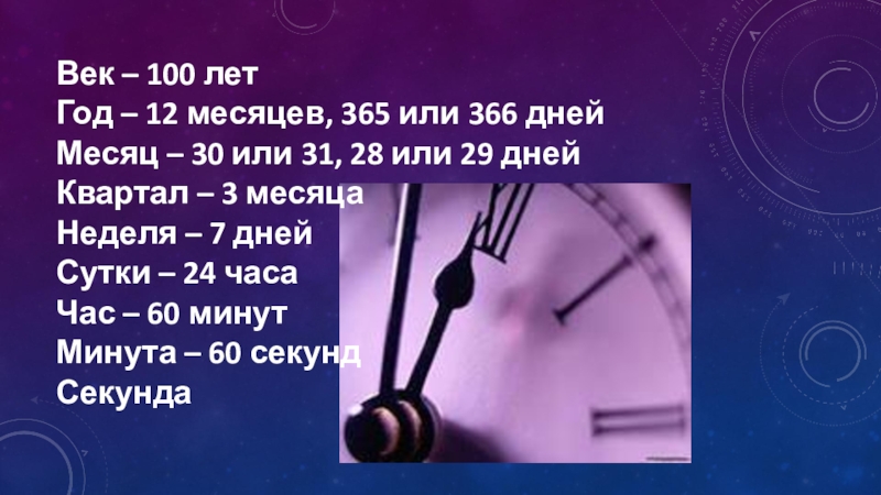– 30 или 31, 28 или 29 дней Квартал – 3 месяца Неделя – 7 дней Сутки – 24 часа Час – 60 минут Минута – 60 секунд Секунда